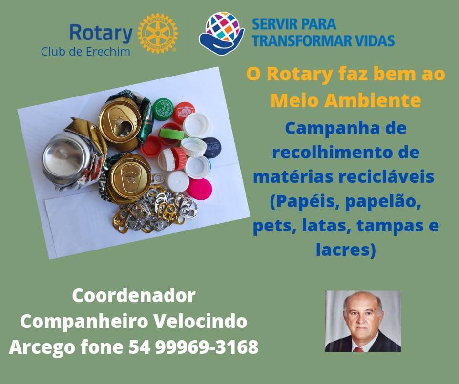 O Rotary Club de Erechim promove dentro do próprio clube a CAMPANHA DE RECOLHIMENTO DE MATERIAIS RECICLÁVEIS, como tampas de garrafa e garrafas pet, lacres, latas de aluminio, etc. Cuja coordenação esta a cargo do Companheiro Velocindo Arcego. Esta atividade vai de encontro com a nova enfase do Rotary Internacional que tem como foco o MEIO AMBIENTE - PRESERVE O PLANETA TERRA.
