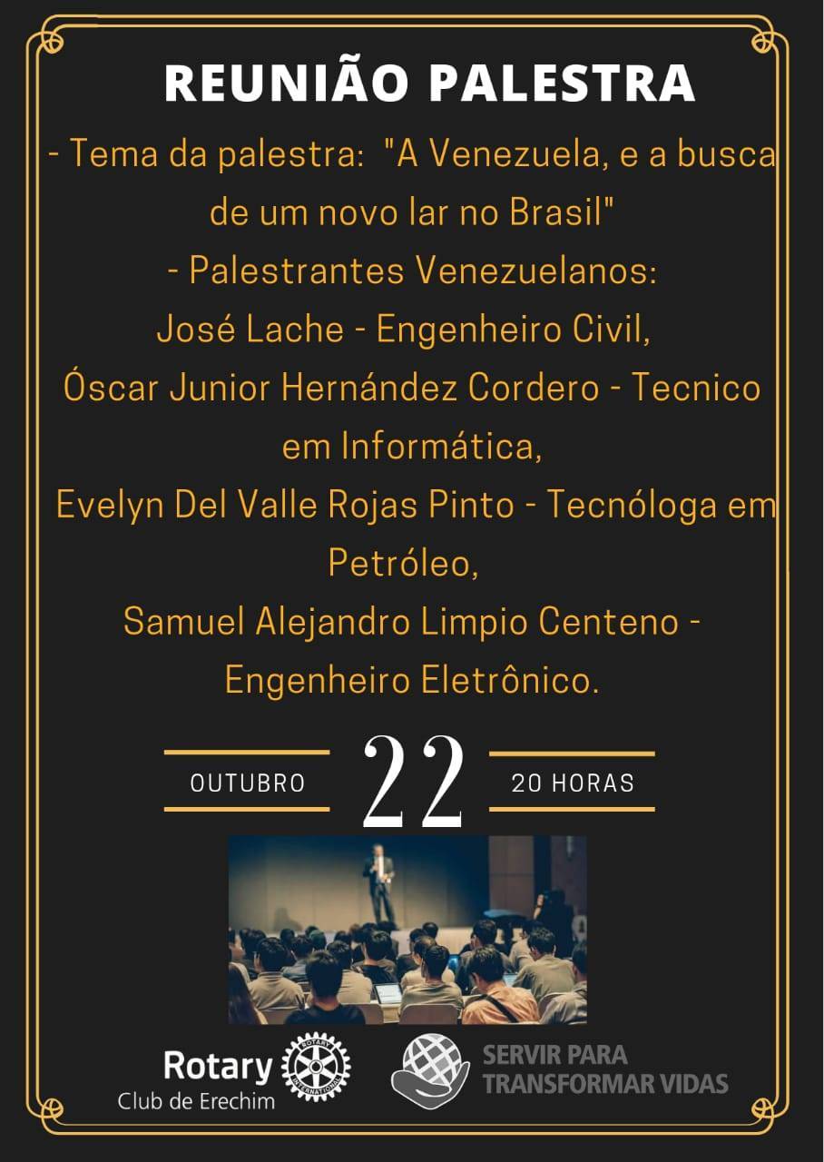 Dia 22 de outubro em sua reunião, o Rotary Club de Erechim receberá uma Comitiva de Refugiados Venezuelanos composta por dois casais. Na oportunidade, farão uma palestra aos associados e convidados com o tema "A Venezuela, e em busca de um novo lar no Brasil". Todos os demais clubes de Rotary de Erechim foram convidados. Além, dosRotaracts, Interact, Rotary Kids, Casa da Amizade e Governador Assistente.
