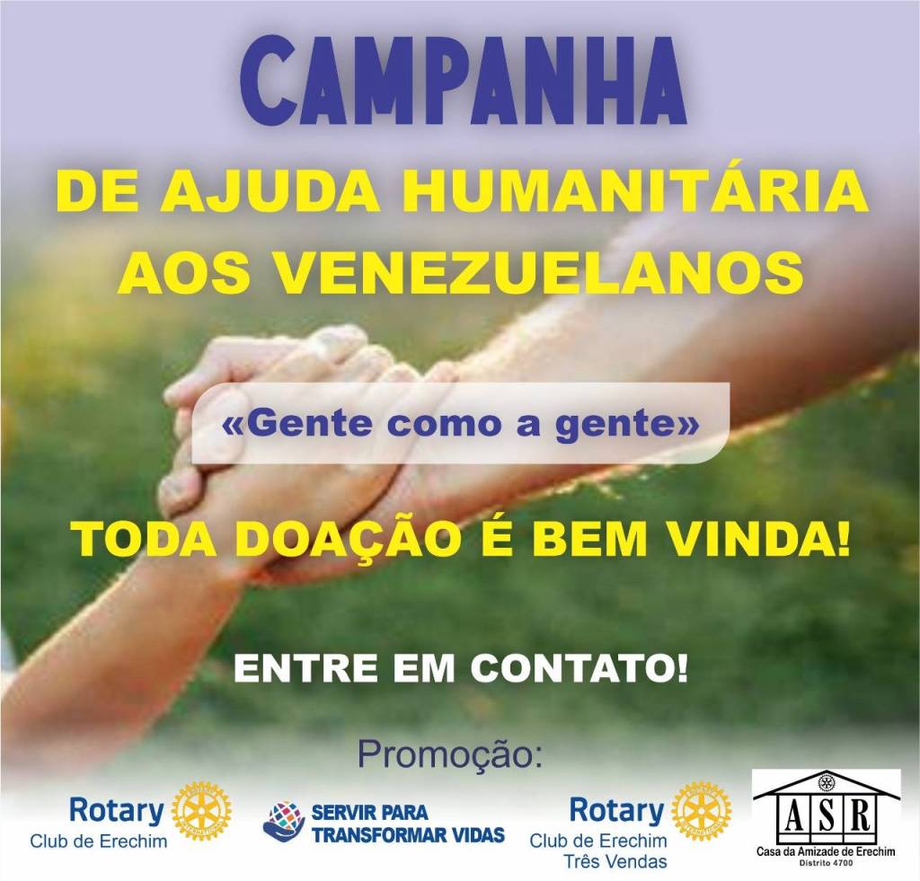 Hoje o Rotary Club de Erechim emparceirado com as CARITAS, Rotary Club Erechim Três Vendas e a Casa da Amizade lançaram a CAMPANHA DE AJUDA HUMANITÁRIA AOS VENEZUELANOS que chegaram em Erechim. Será buscado apoio e parceria dos órgãos de imprensa local para envolver a população de um modo geral, sendo aceito cestas básicas, roupas, utensilios, móveis, entre outros bens.